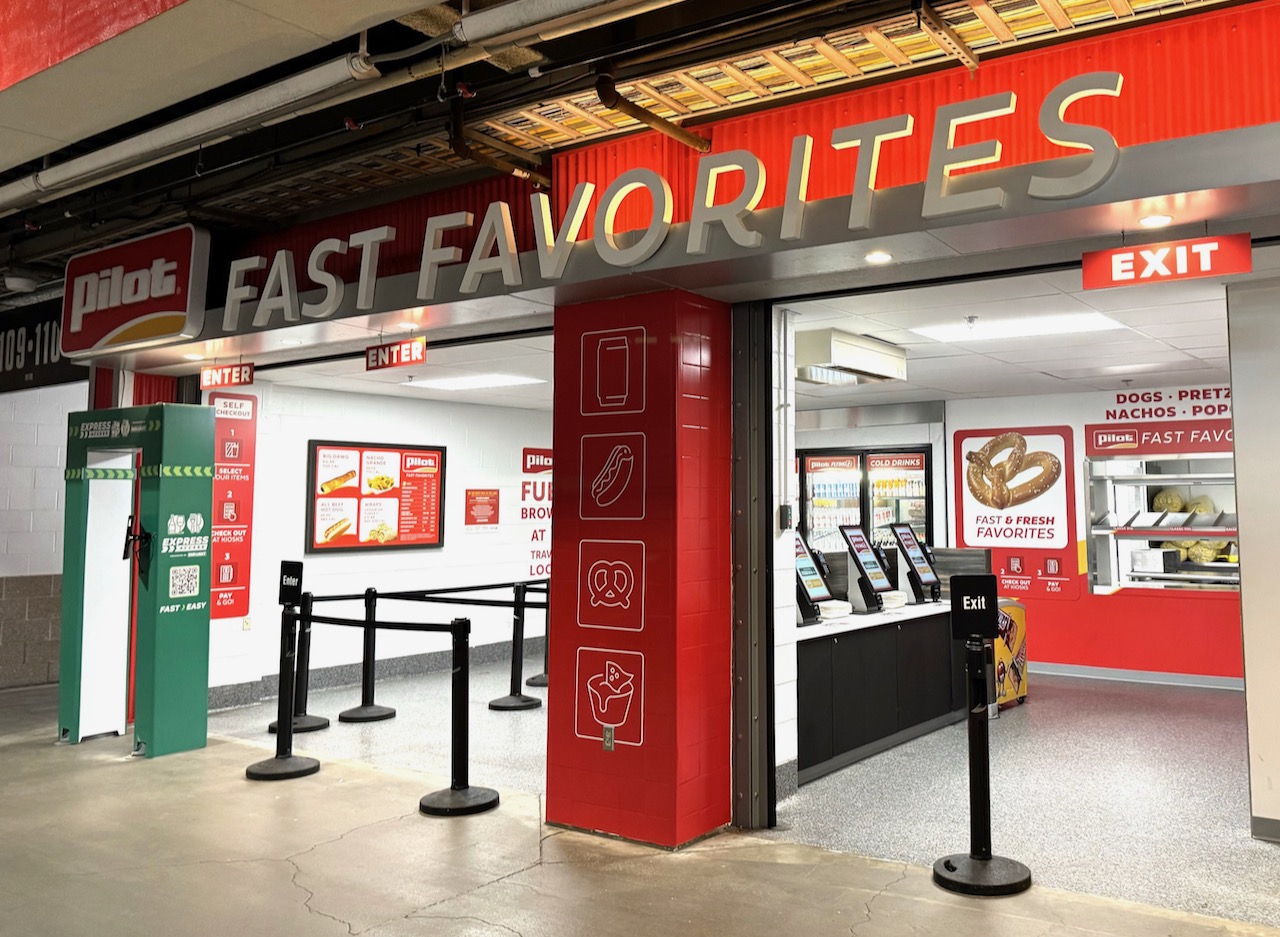Ten of these stands are permanent structures in concourse locations, with express lanes for facial authentication customers and regular lanes for other customers. The joint access for Express and non-Express customers, Covert said, allows any fan to use the stands for purchases while preserving the “express” amenity of the facial-authentication program.